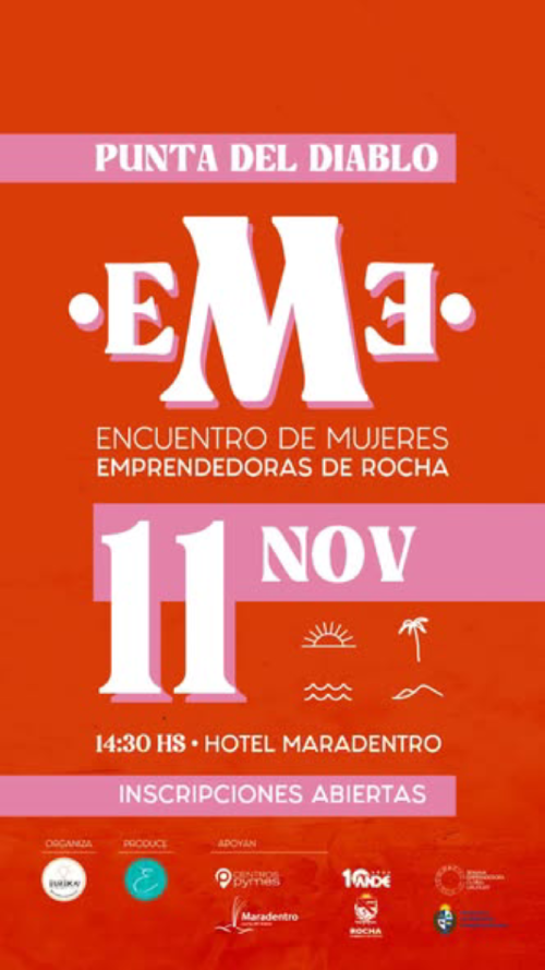 El Gobierno departamental de Rocha apoya la iniciativa del equipo de Eureka! Instituto de Capacitación y Desarrollo Empresarial, quienes presentan este evento que se impulsa desde el área de Producciòn y Desarrollo. Se trata de la 1.ª edición del Encuentro de Mujeres Emprendedoras de Rocha, que se realizará el 11 de noviembre en Punta del Diablo, a partir de las 14:30 horas.