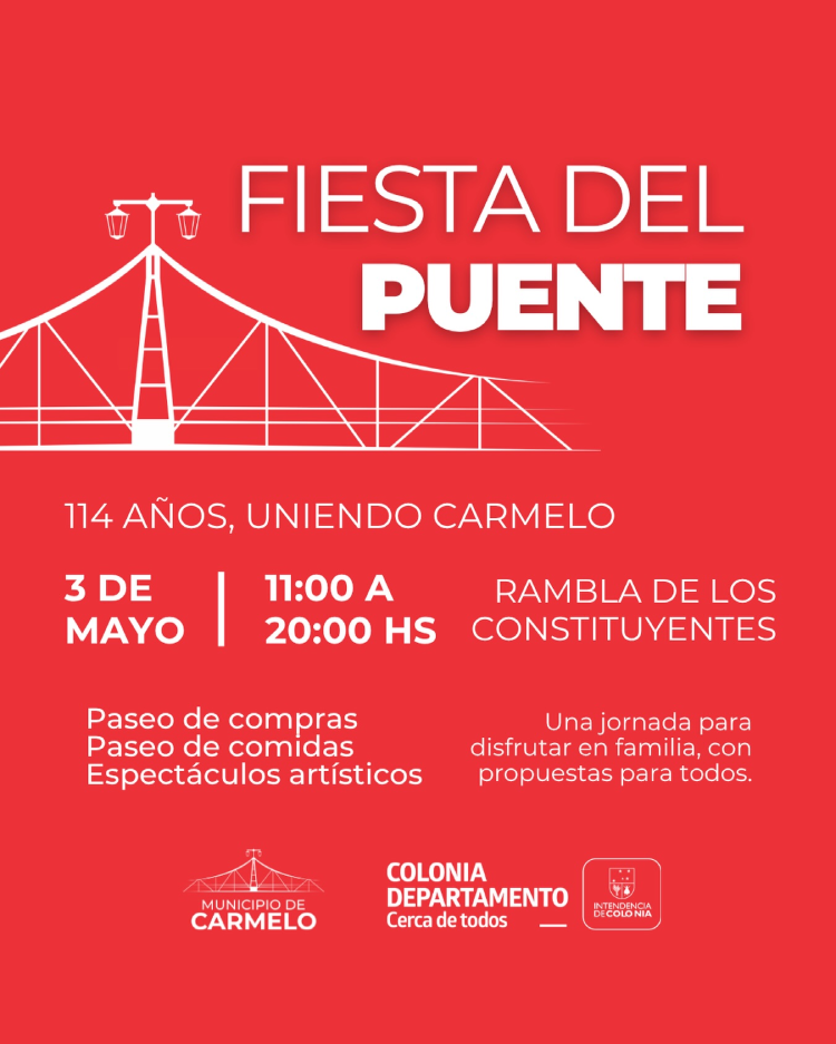 La ciudad de Carmelo se prepara para una nueva edición de la Fiesta del Puente, un evento que conmemora el 114.º aniversario de su histórica estructura giratoria, símbolo de identidad y unidad para la comunidad local. La celebración, organizada por el Municipio de Carmelo con el apoyo de la Intendencia de Colonia, tendrá lugar el próximo sábado 3 de mayo.