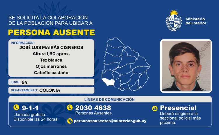 La jefatura de policía de Colonia solicita la colaboración de la población para ubicar a José Luis Mairás Cisneros de 24 años, mide 1.60, tez blanca,...